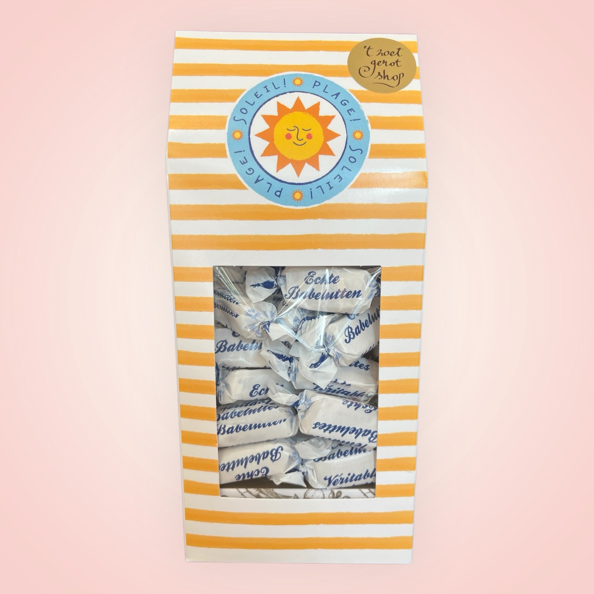 Breng de sfeer van de Belgische kust tot leven met dit zonnige doosje vol echte Babelutten – zachte, romige botersnoepjes met een vleugje zee en een flinke dosis nostalgie.