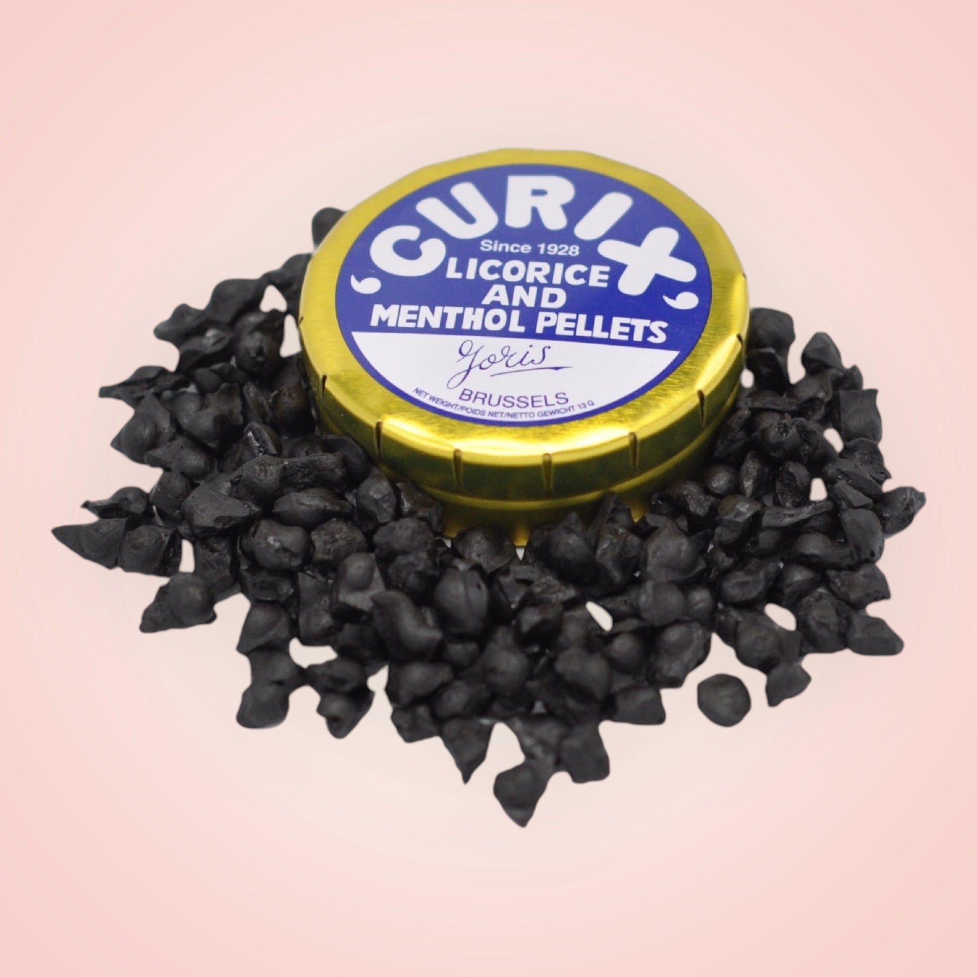 De bekende blikjes Curix van Joris, uit grootmoeders tijd, bevatten kleine zwarte drop/munt pareltjes.