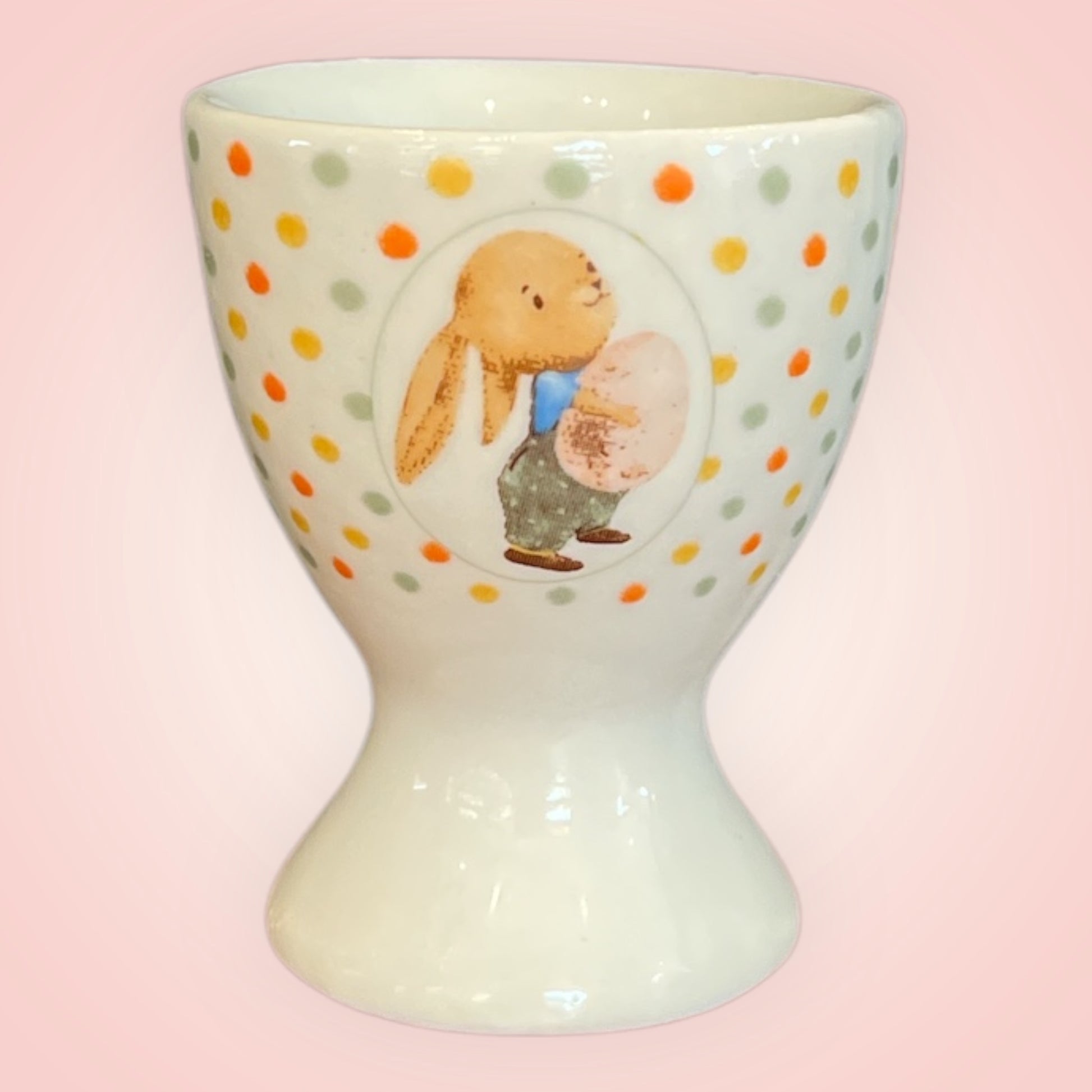 Lief eierdopje met schattig konijntje en kleurrijke stipjes.Perfect voor het paasontbijt of om je tafel extra gezellig te maken. Combineer met bijpassende mok voor een feestelijk geheel