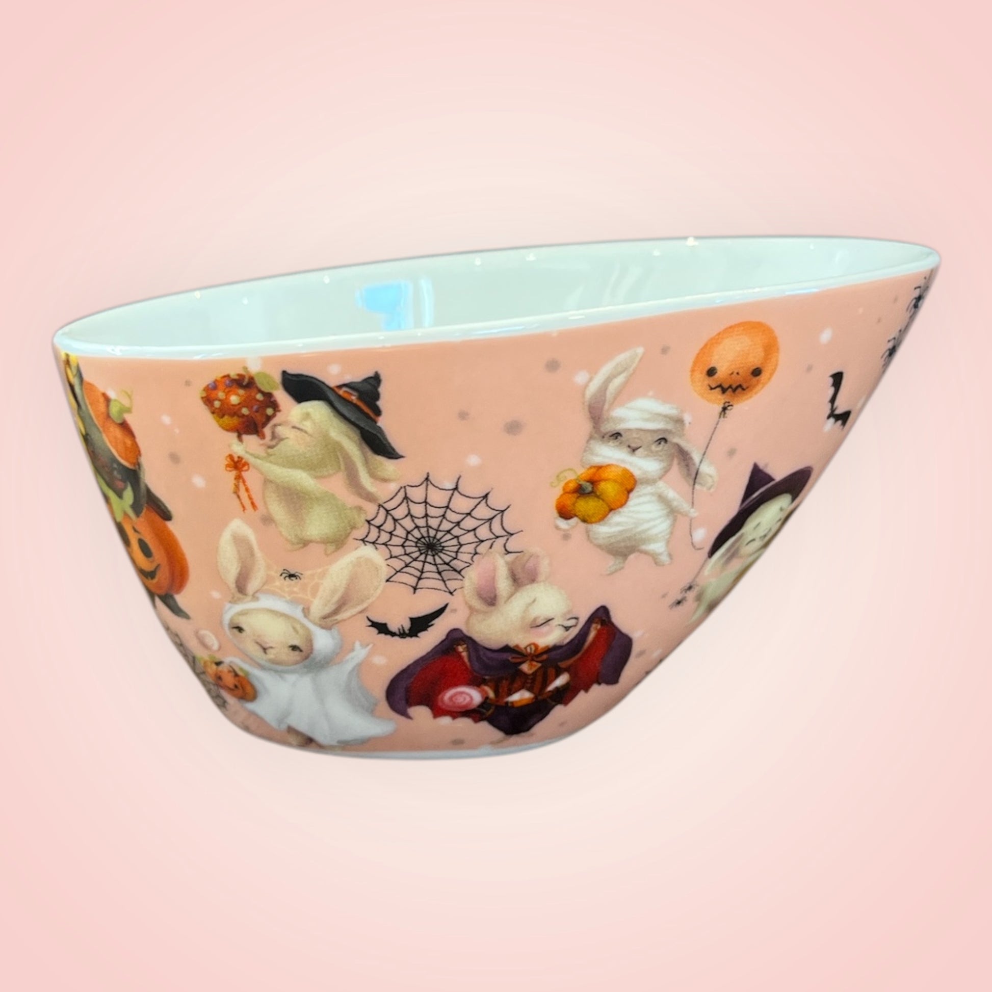 Dit Halloween kommetje heeft een schattig ontwerp met konijntjes verkleed in Halloweenkostuums, omringd door pompoenen, spinnenwebben, snoep en vleermuizen op een zachtroze achtergrond. Perfect voor een gezellige, feestelijke sfeer πΈοΈπ