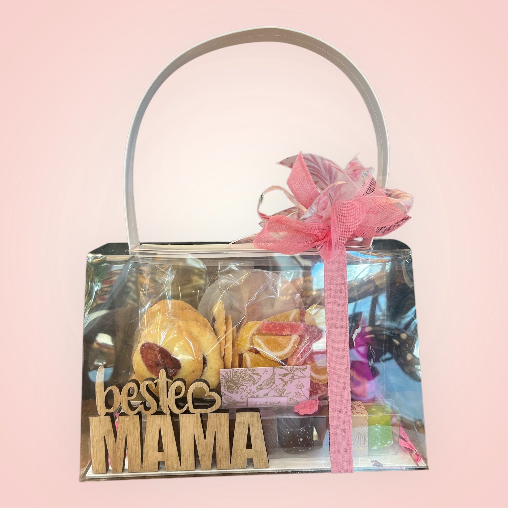 Zakje Koekjes, zakje snoepjes, marshmallow, houten bordje beste mama , tube pralines