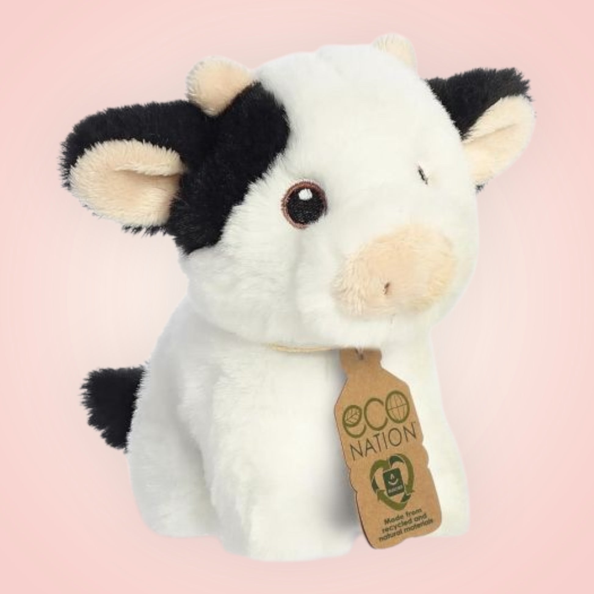 Eco Nation mini koe 13 cm Ooit was ik een plastic fles! Deze Eco knuffellijn is geheel gemaakt van gerecycled materiaal, elke knuffel wordt gemaakt van zo'n 6 halve liter petflesjes. De petflessen worden vermalen tot pellets (korrels). De pellets worden gesmolten en verwerkt tot garen. De garen worden gebruikt voor de knuffel productie. De knuffels hebben geen kraalogen maar geborduurde ogen. Het is ongelooflijk dat de knuffels toch zo zacht zijn, een prachtige kwaliteit. De volledige knuffel; de buitenkant, de vulling, de kartonnen labels, zijn gemaakt van gerecycled materiaal en natuurlijke materialen. Deze Eco Nation lijn draagt daarmee optimaal bij aan een groenere planeet!