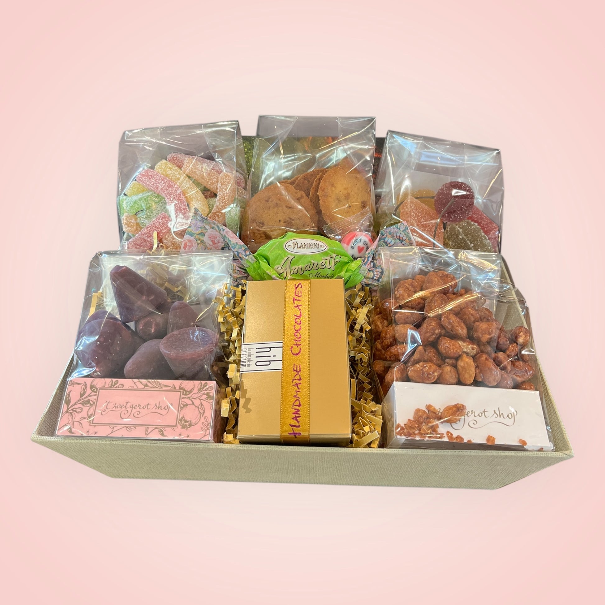 Laat je verleiden door deze geschenkmand vol ambachtelijke zoetigheden. Perfect om cadeau te geven of jezelf mee te verwennen. Deze mand bevat een zorgvuldig samengestelde selectie van lekkernijen, waaronder: