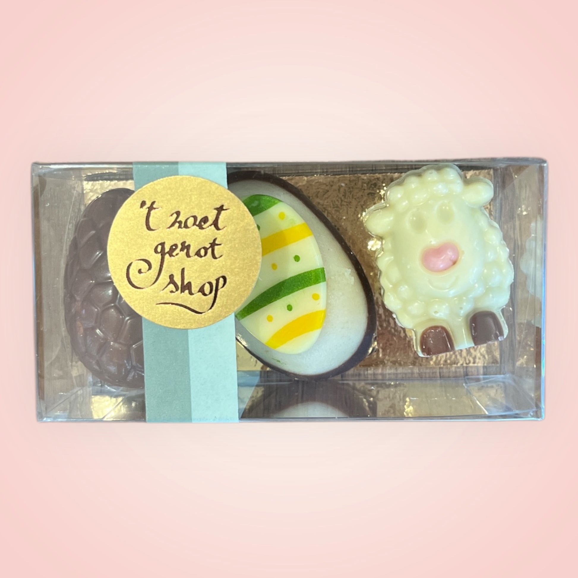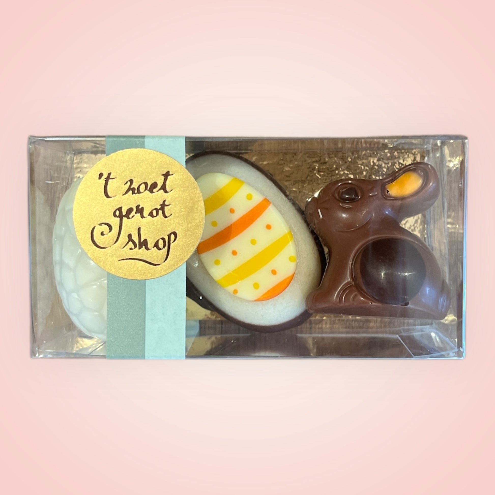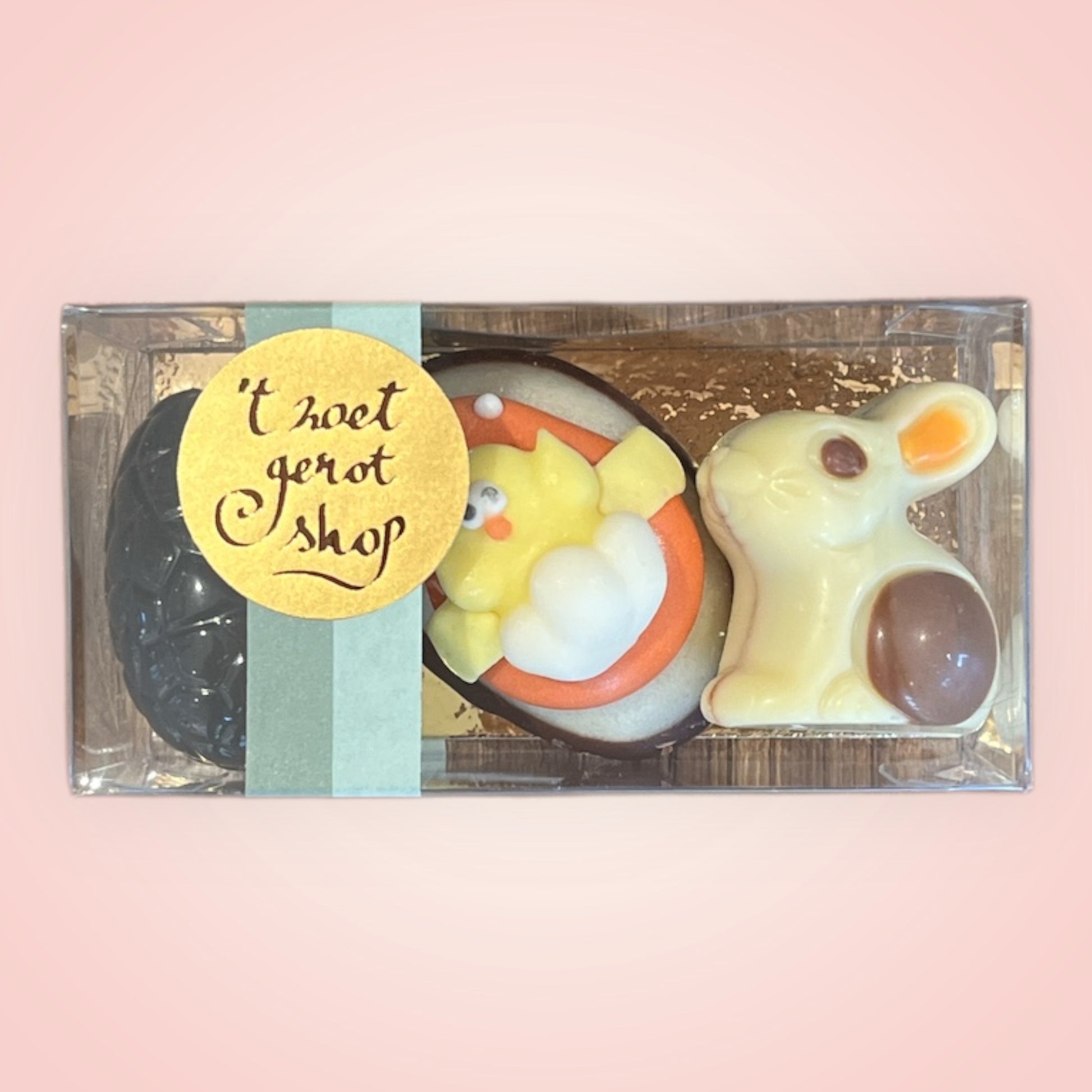Leuk doosje met 3 ambachtelijke paaspralines. Een smaakvol geschenk, perfect als klein relatiegeschenk of attentie voor Pasen