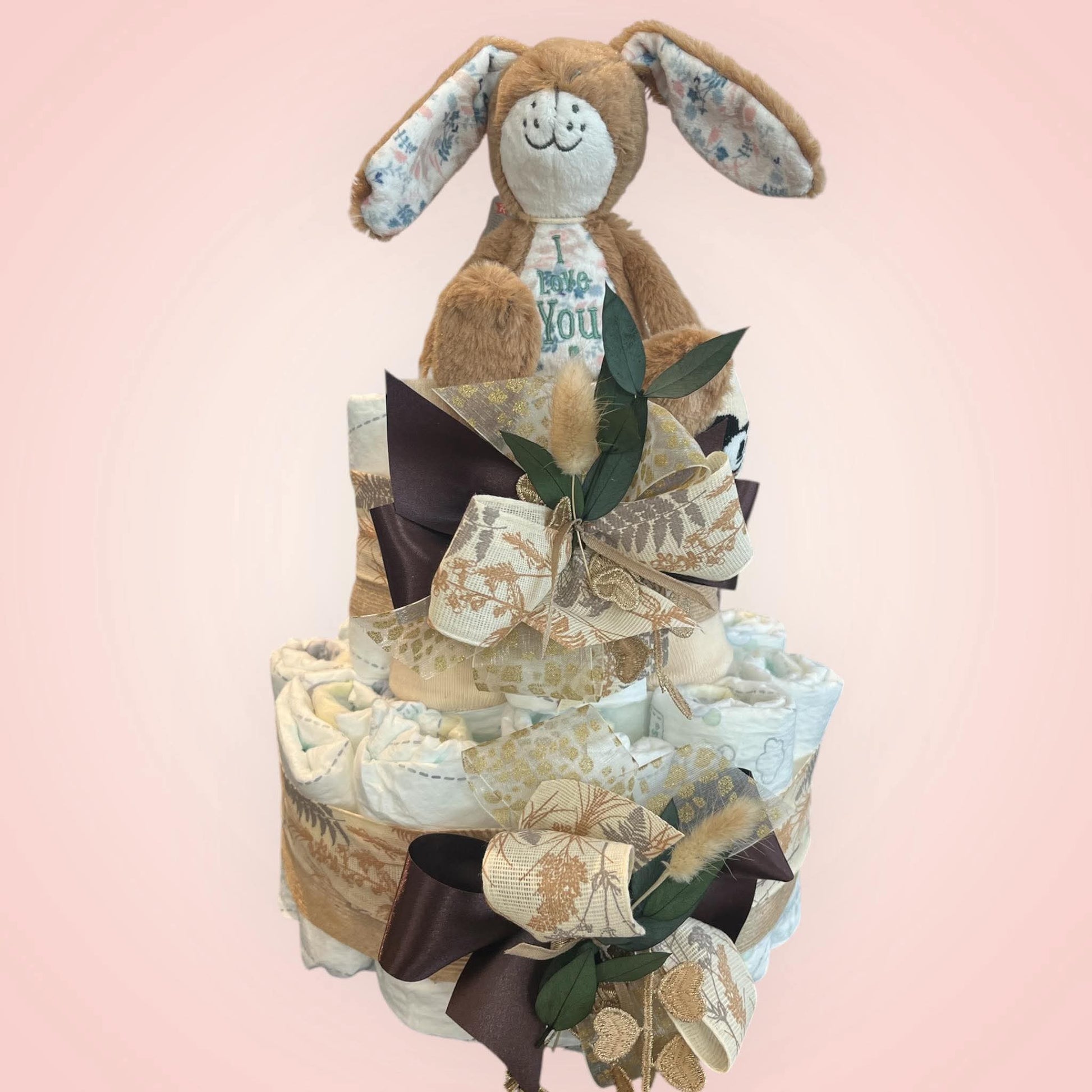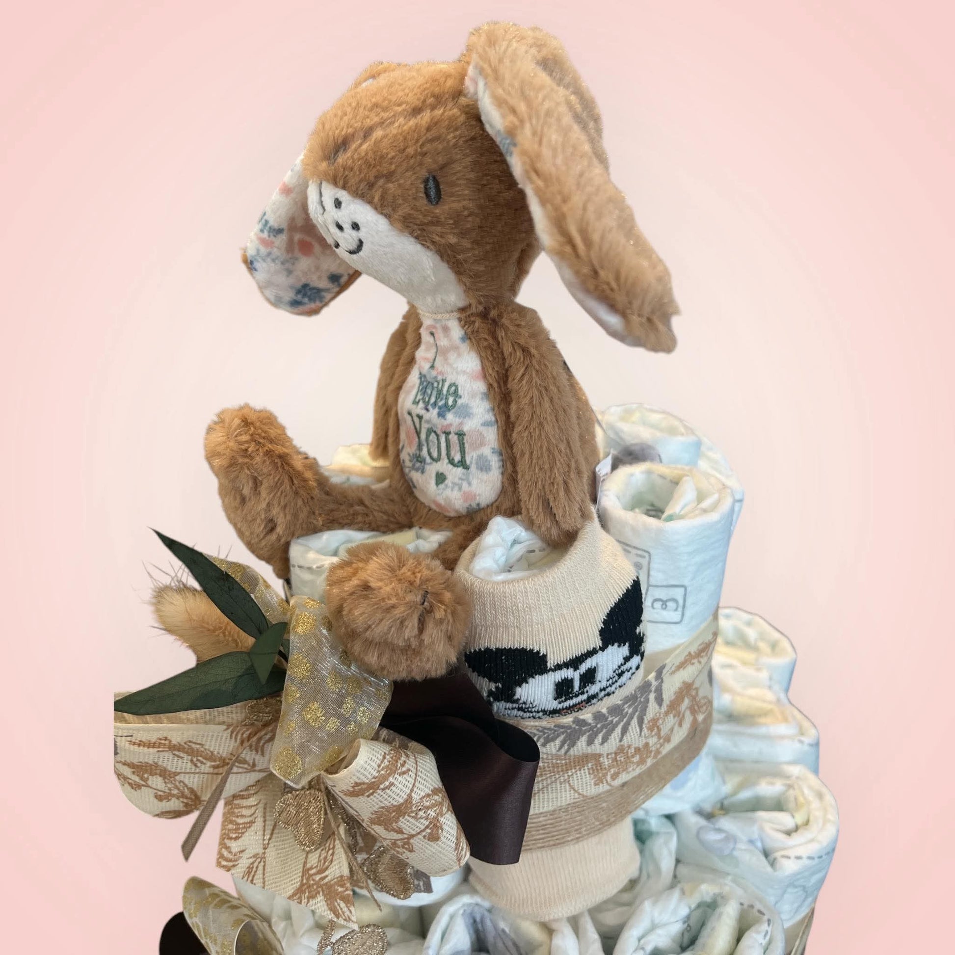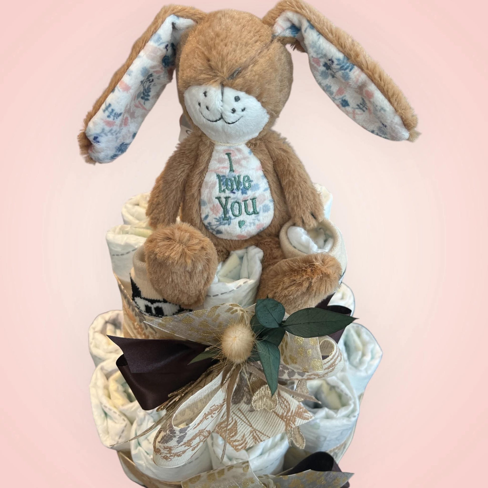 Deze prachtige luiertaart is met zorg handgemaakt en bevat 28 of 48 luiers van het merk Pampers, een snoepkoker en een paar kousjes , stijlvol afgewerkt in neutrale tinten. Bovenop troont Hazeltje, een zachte en knuffelbare konijnenvriend, klaar om het nieuwe wereldwonder te vergezellen.