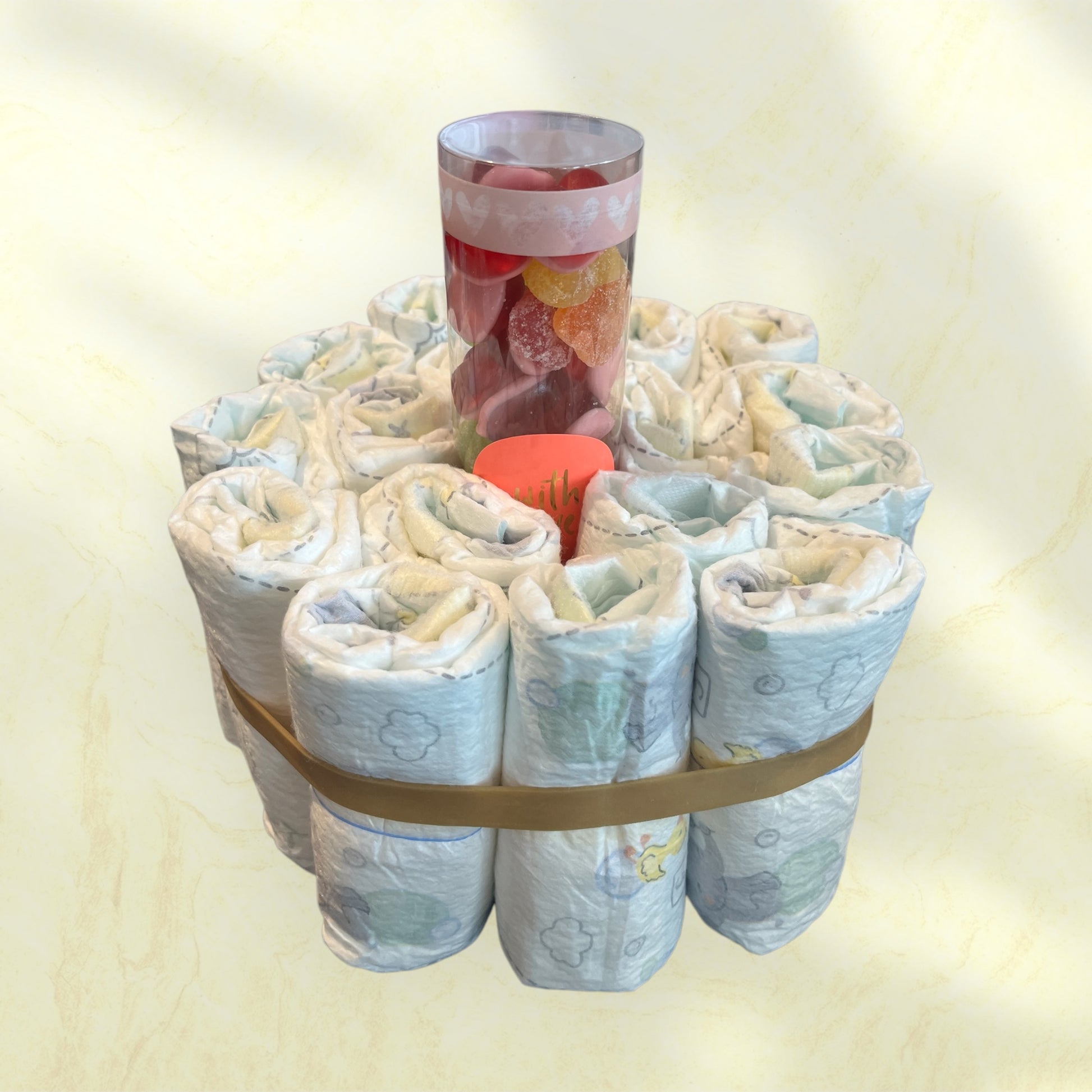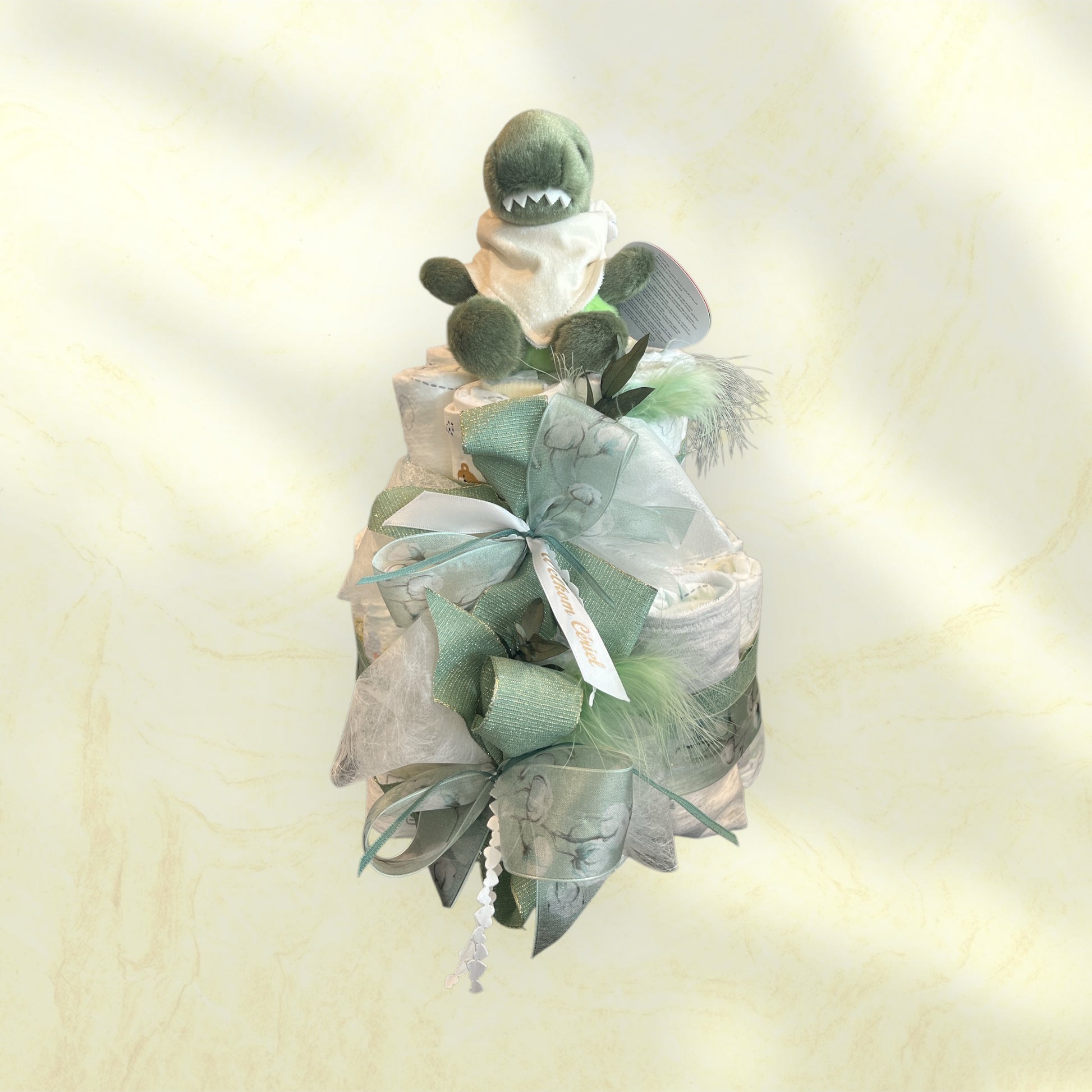 Deze speelse pampertaart met een schattige dino knuffel is het perfecte cadeau voor kersverse ouders. De taart is gemaakt met 28 luiers van het merk Pampers en bevat drie handige slabbetjes én een verborgen snoepkoker als extra verrassing.