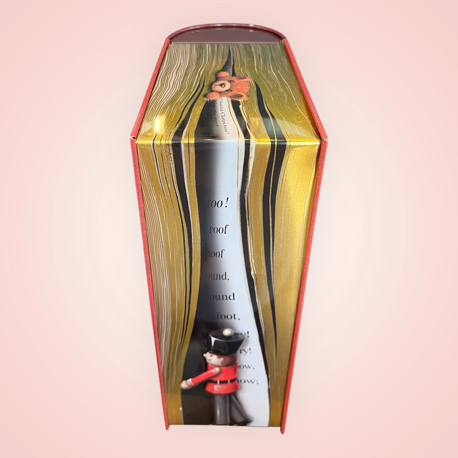 Breng de magie van Kerst in huis met dit betoverende kerstblik in de vorm van een klassiek boek. De kaft toont een warme, nostalgische afbeelding van de Kerstman met zijn zak vol cadeautjes, omlijst met sierlijke gouden details in 3D-reliëf.