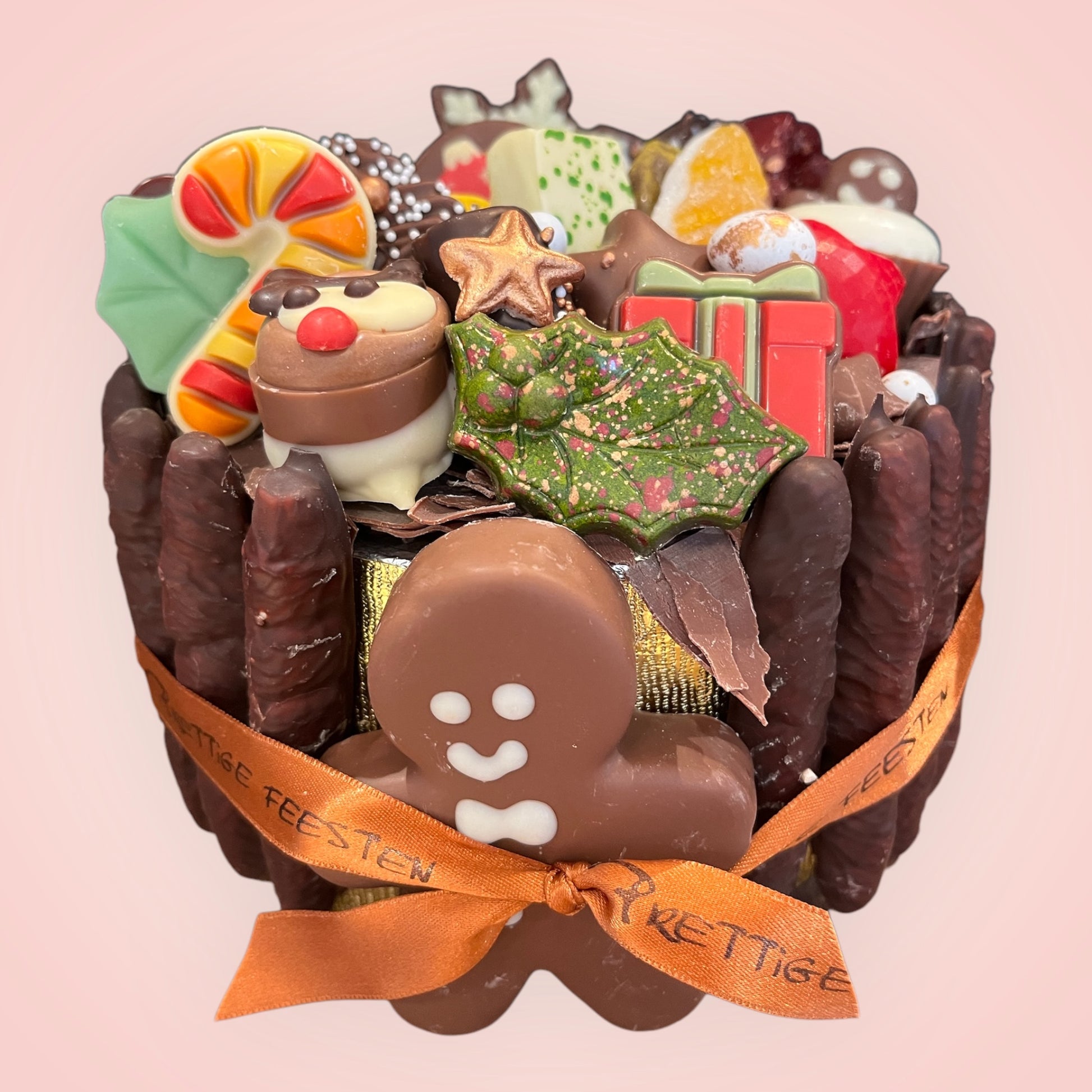 Pralinetaart diameter 20cm - ongeveer 1KG, versierd met handgemaakte kerst pralines en zachte guimauve. Perfect als geschenk of als heerlijke blikvanger op de feesttafel.