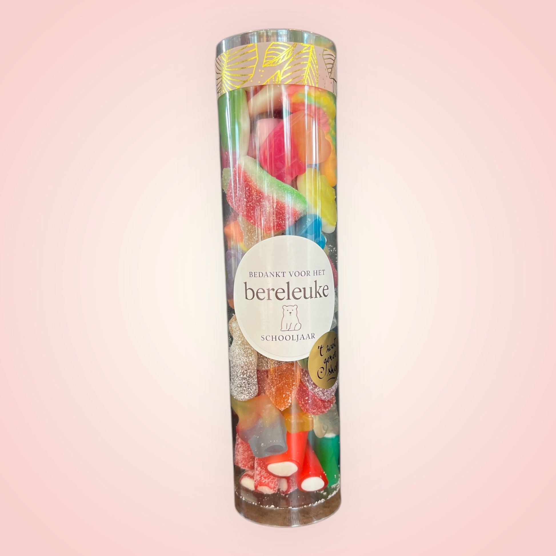 Op de koker staat er een liefdevolle boodschap “Bedankt voor het bereleuke schooljaar”. Binnenin vind je een kleurrijke mix van heerlijke zure beertjes , kersjes, perzikken, …. een echte traktatie dus