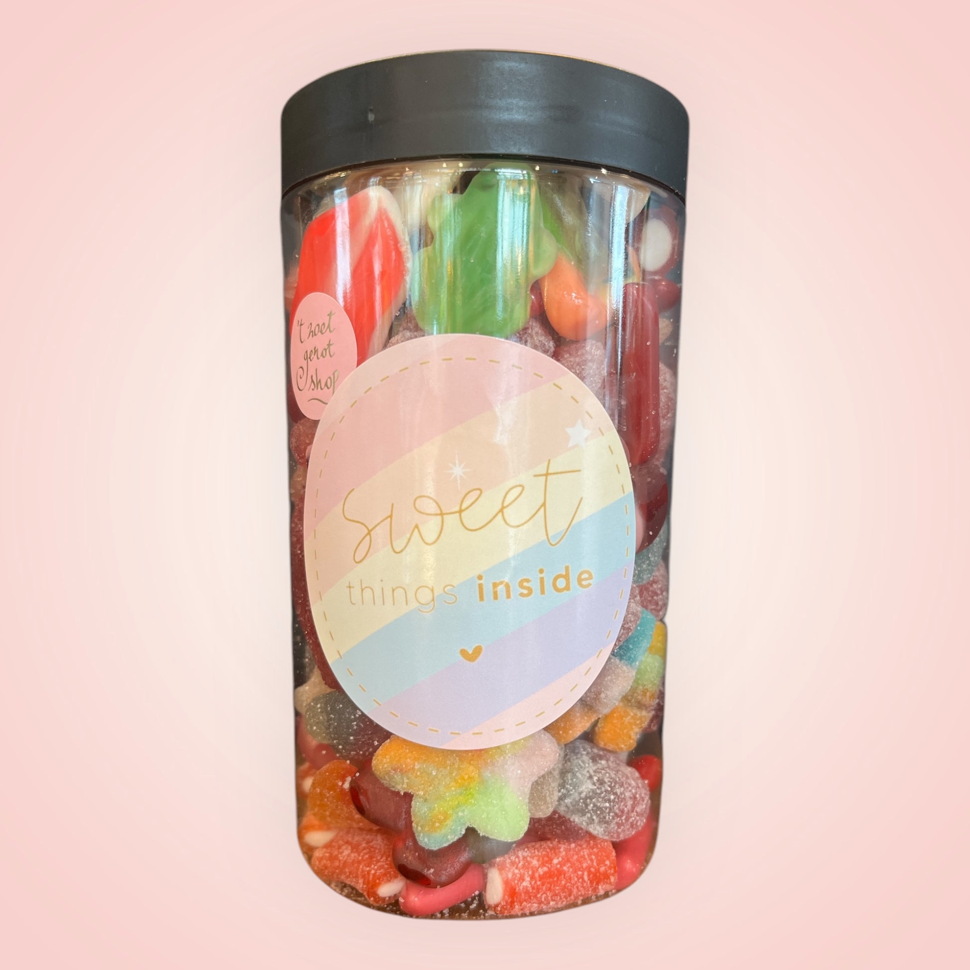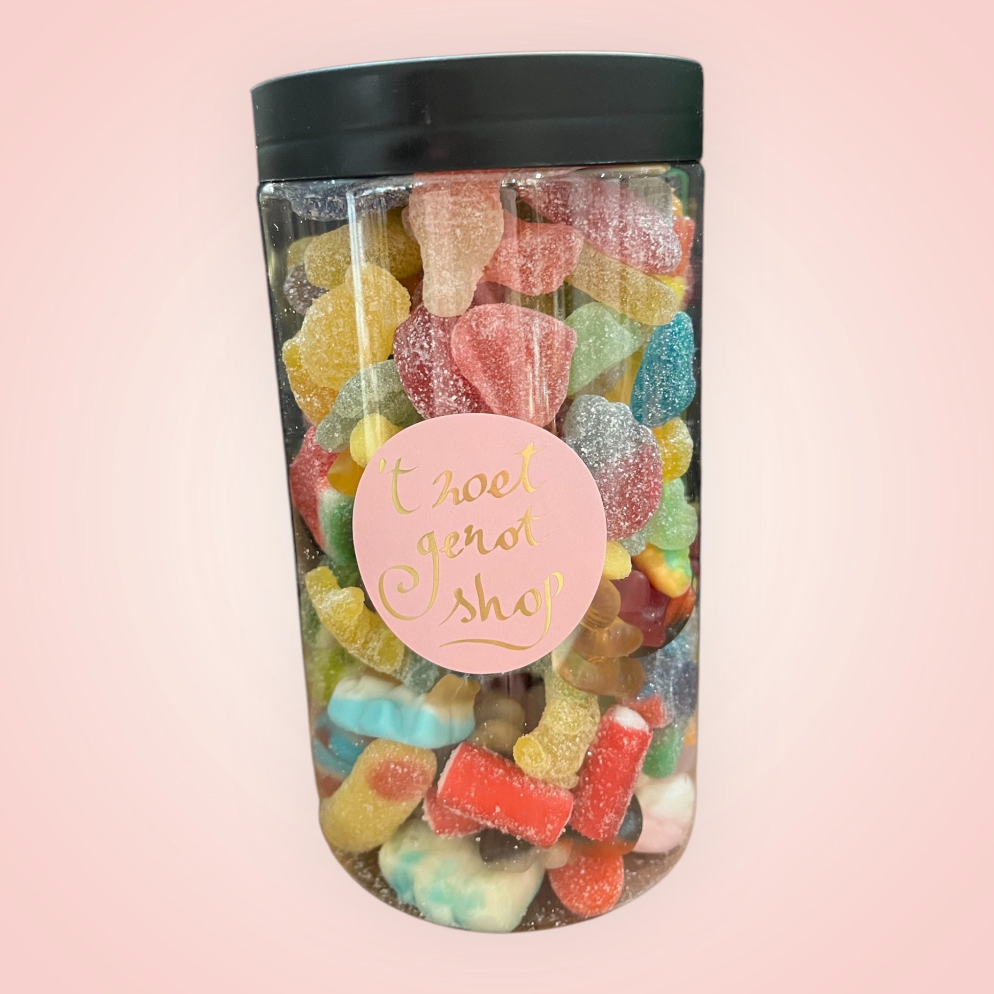 Ontdek onze goedgevulde snoeppot met een kleurrijke mix van schepsnoep. Deze pot bevat een vrolijke verzameling van je favoriete snoepjes, perfect om te delen, cadeau te doen, of gewoon zelf van te genieten. Handig om steeds weer aan te vullen en ideaal voor elke zoetekauw.