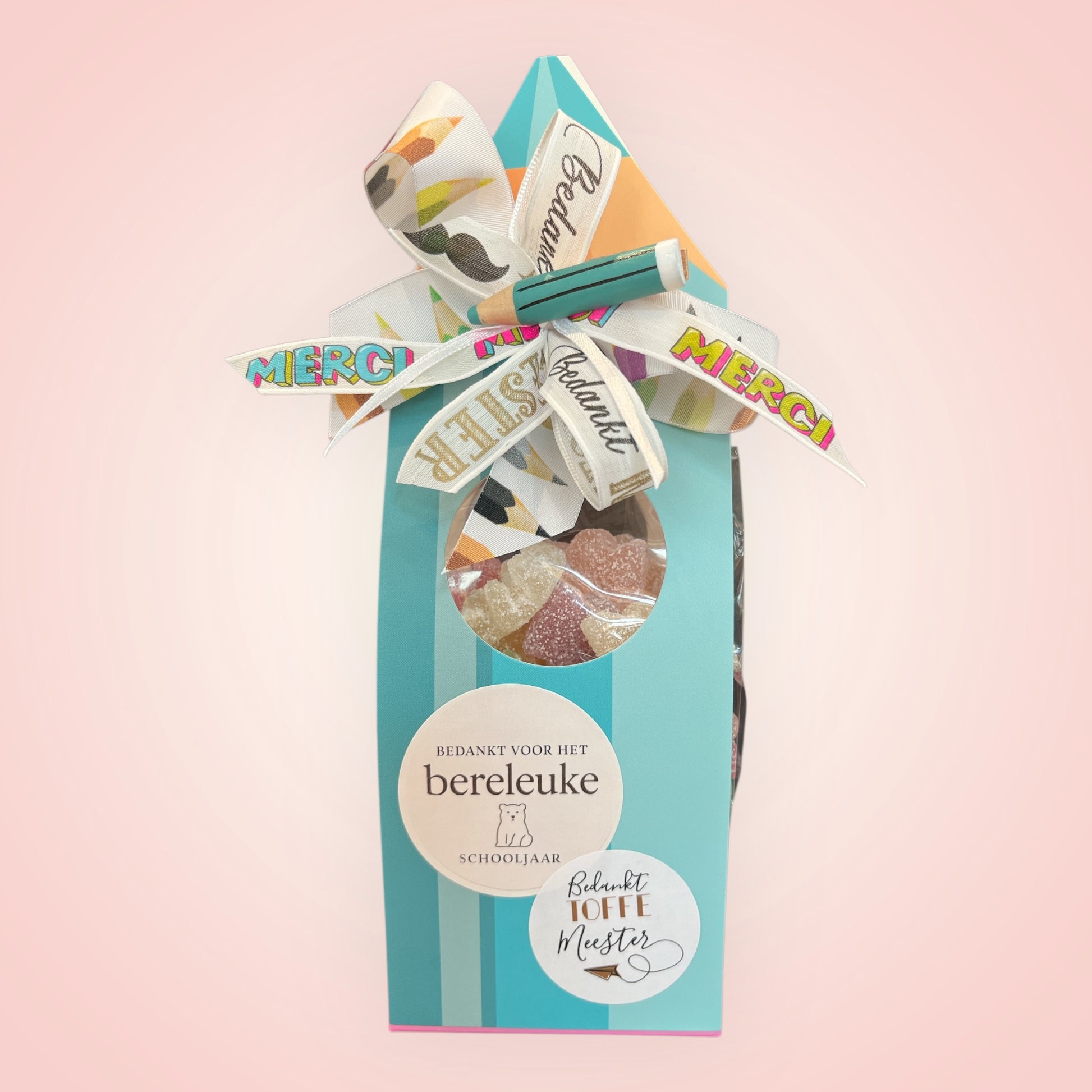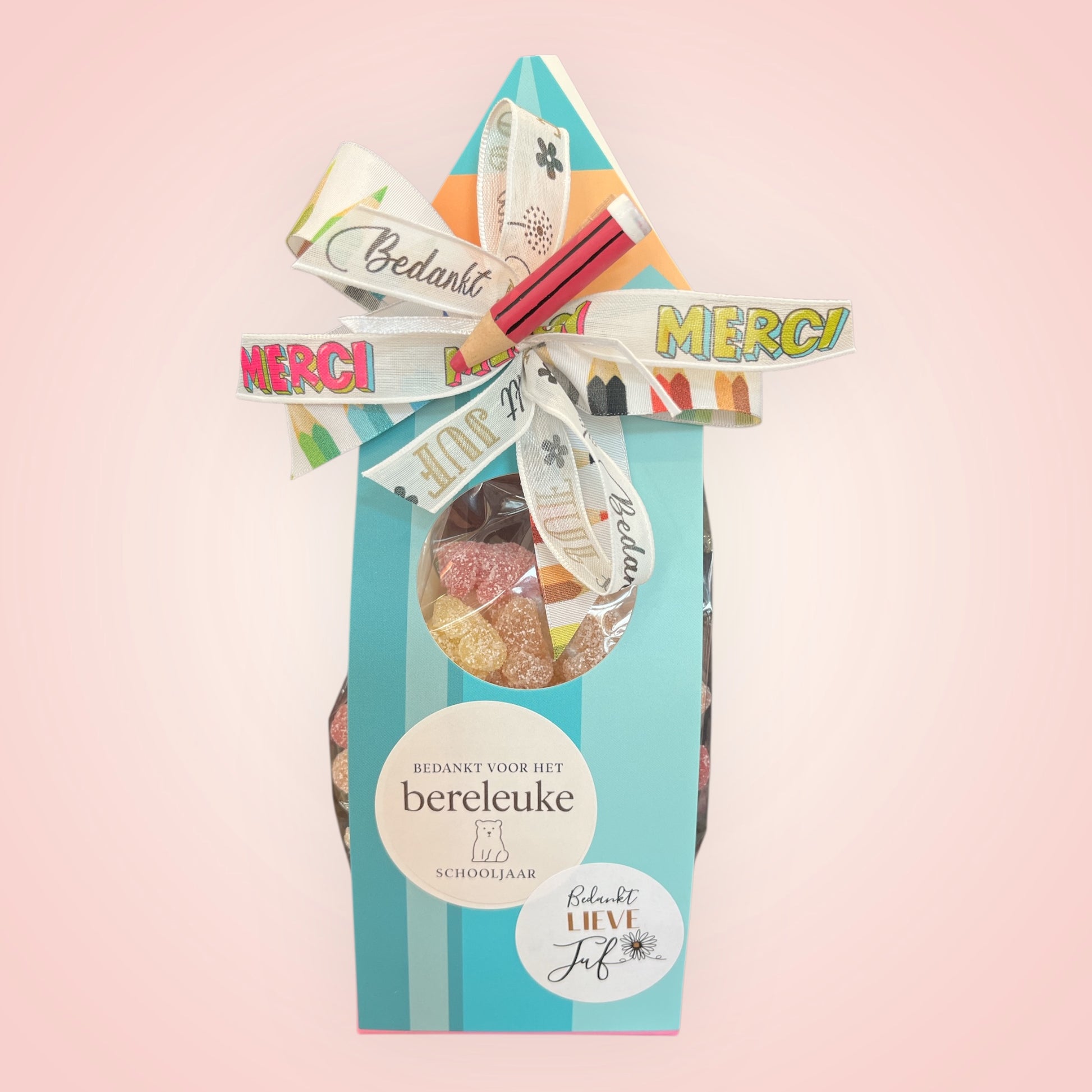 Sluit het schooljaar af met een glimlach dankzij dit originele bedankje in de vorm van een vrolijk gekleurd potlood. Het doosje is feestelijk versierd met kleurrijke linten en een liefdevolle boodschap zoals “Bedankt voor het bereleuke schooljaar”. Binnenin vind je een kleurrijke mix van de heerlijke zure beertjes van Joris onthult – een echte traktatie