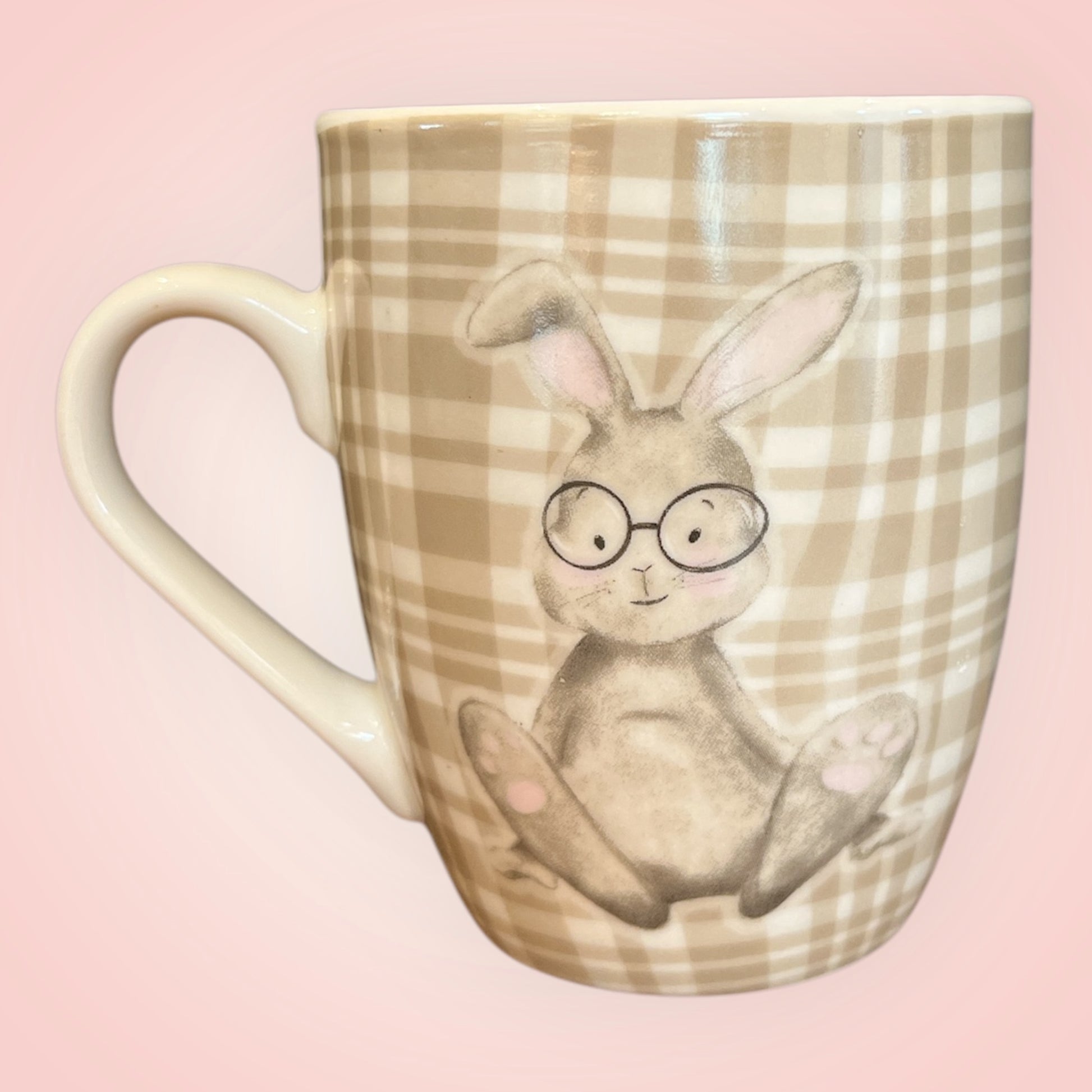 Ontmoet Charlie, het slimme konijntje met bril. Deze gezellige mok met zacht ruitjespatroon brengt gegarandeerd een glimlach bij je koffie- of theemoment. Perfect als cadeau of voor jezelf