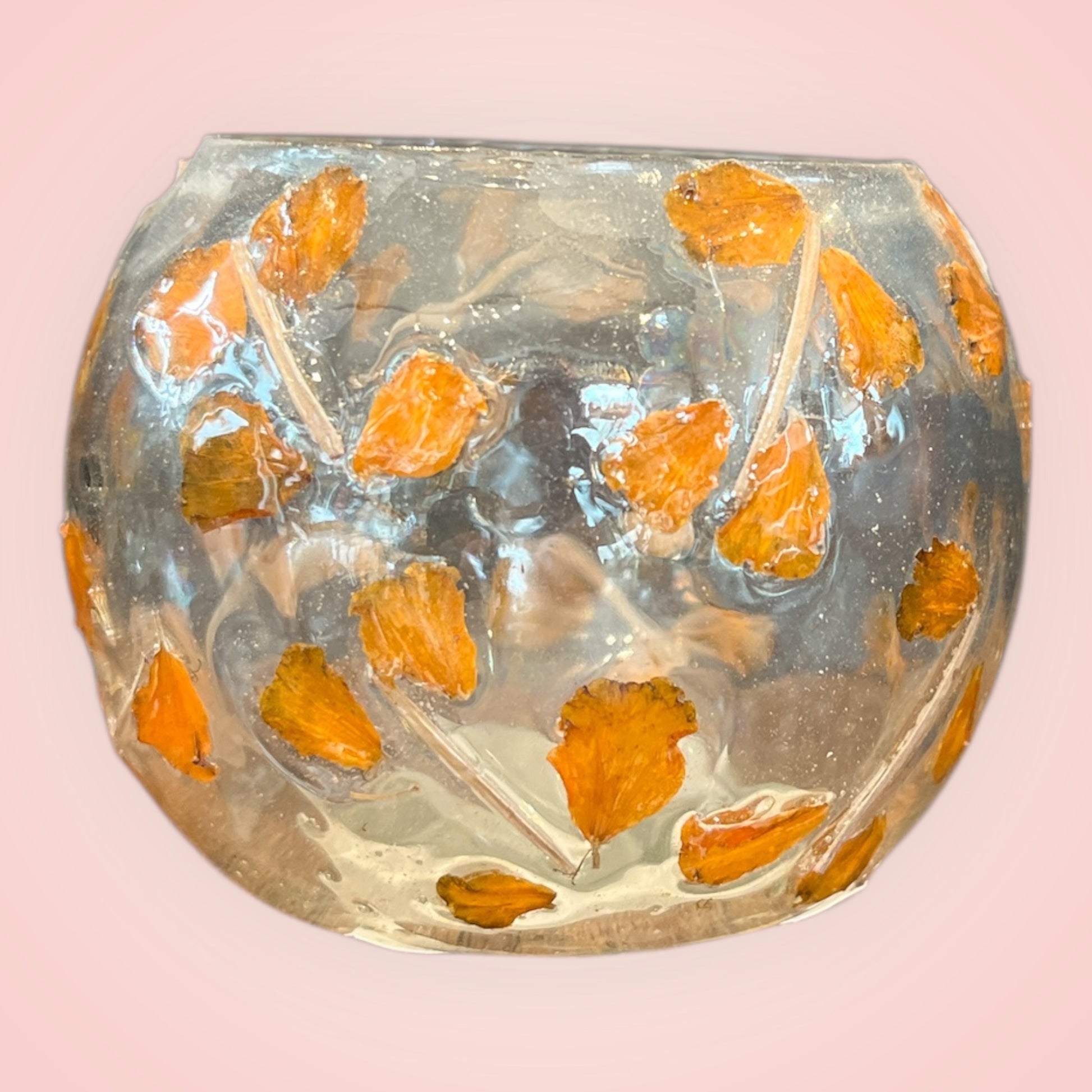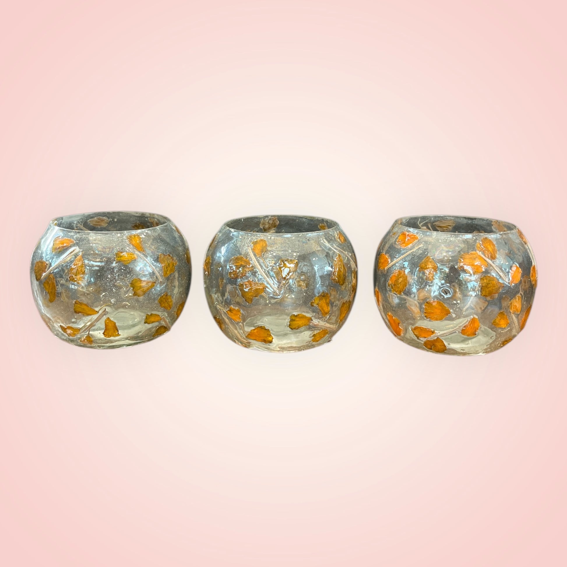 gezellige avonden met deze prachtige theelichthouders in transparant glas met oranje bloemblaadjes die je er bovenop voelt liggen