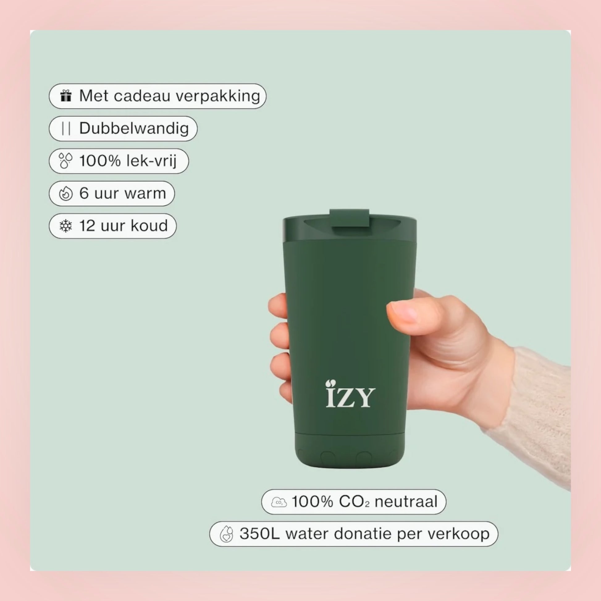 Of je nu een wandeling maakt, een dagje onderweg bent of gewoon een moment voor jezelf neemt: met de IZY Mugs x Groen kan je zorgeloos en langer genieten van je warme drankje als koffie of thee – duurzaam, stijlvol en op temperatuur.