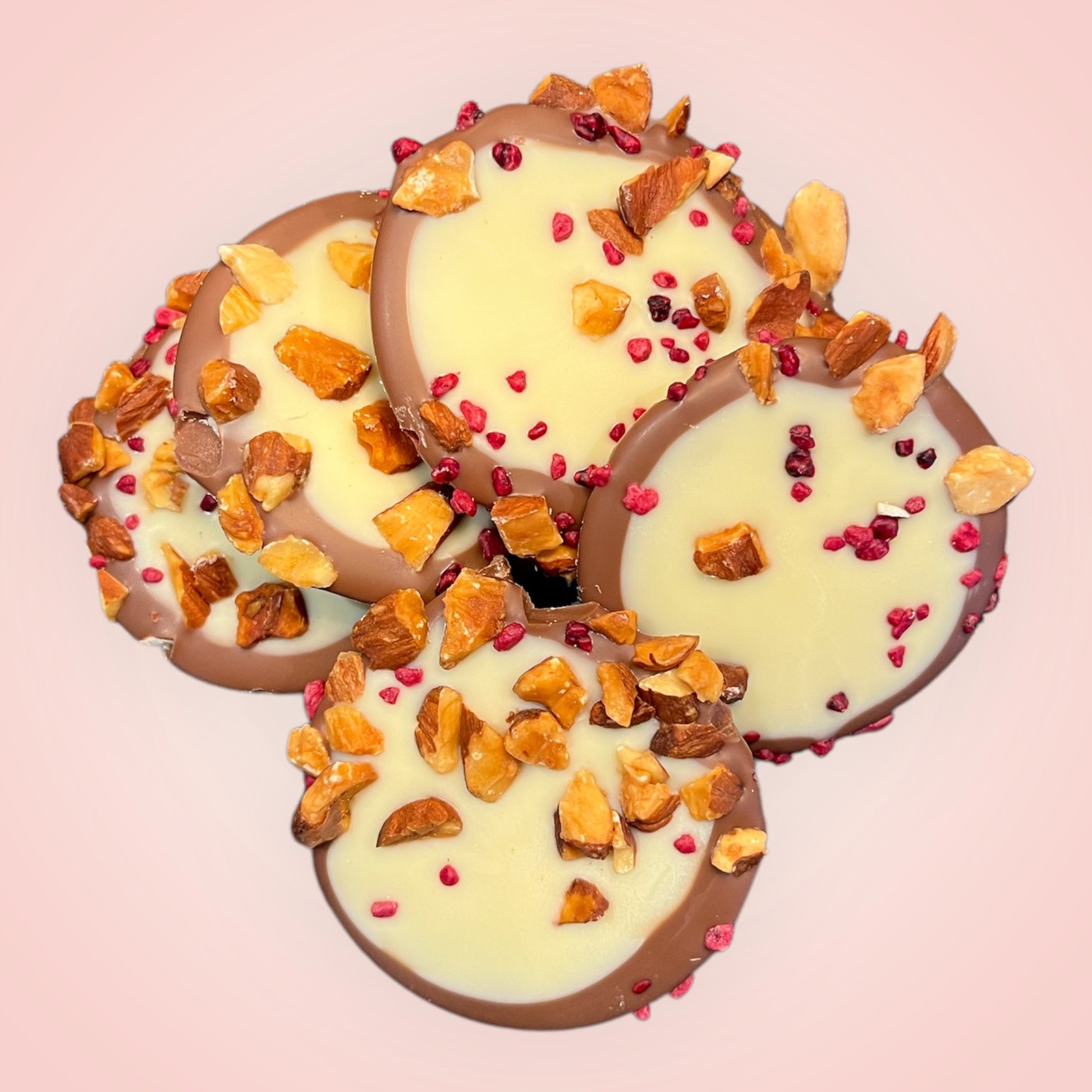Deze overheerlijke chocoladeschijfjes in 2 kleuren zijn bedekt met gecarameliseerde nootjes en gevriesdroogde framboosjes 200gr