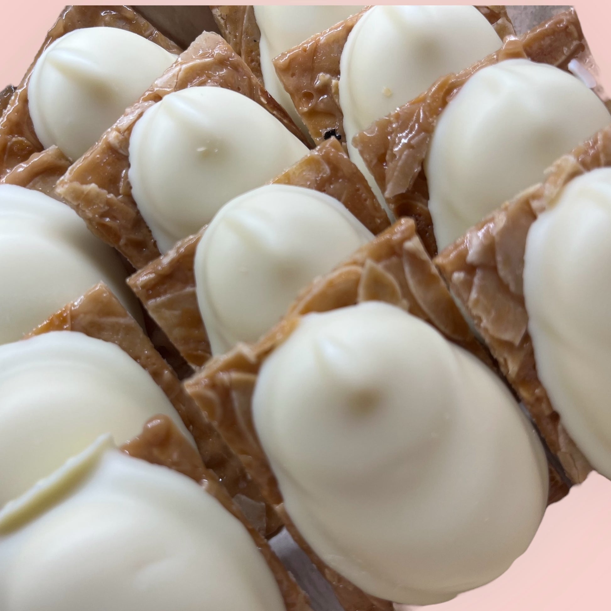 Ontdek de heerlijke smaak van Zwevezeelse Florentientjes, een ambachtelijke lekkernij met een rijke traditie. Deze verfijnde koekjes combineren krokante amandelschilfers met een zalige karameltoets, afgewerkt met een laagje Belgische chocolade.